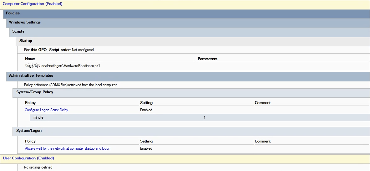 - Copy the adapted HardwareReadiness.ps1 file script file to the domain controller in the folder \\[domain.local]\netlogon