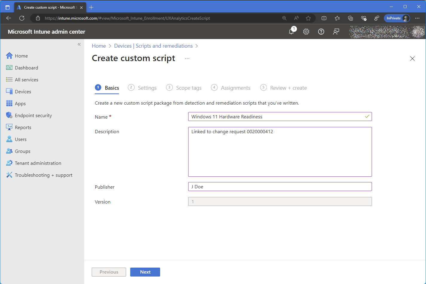 - Now, on the Basics step of the custom script deployment, input an appropriate name and description and choose Next.