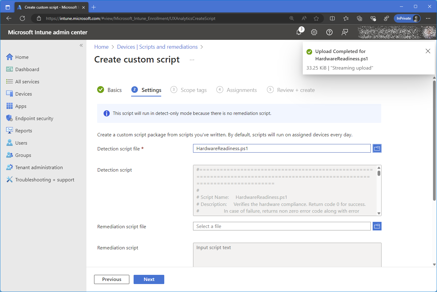 - On the Settings step of the custom script deployment, choose the folder icon next to the Detection script file to navigate to Microsoft's Hardware Readiness script downloaded earlier.