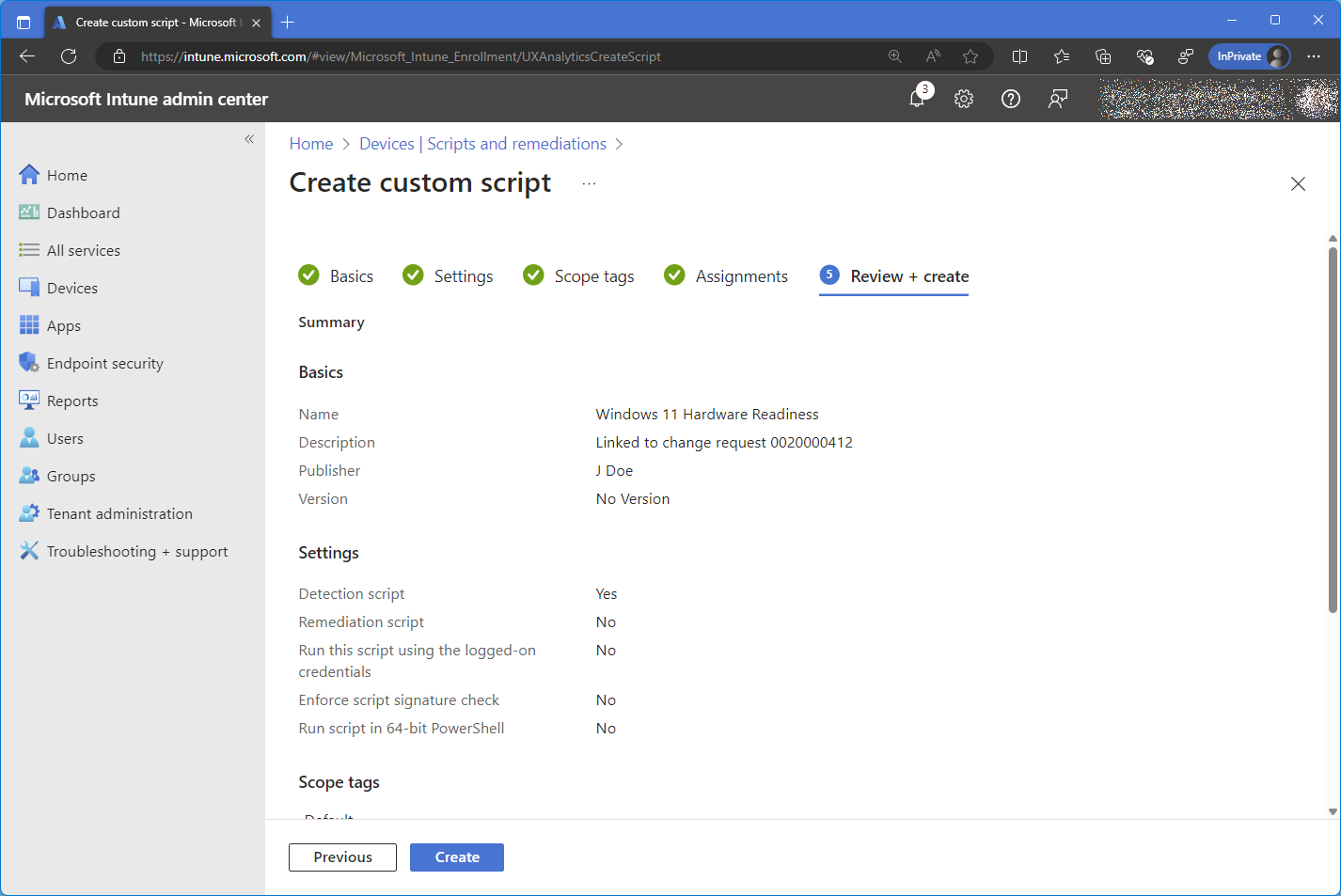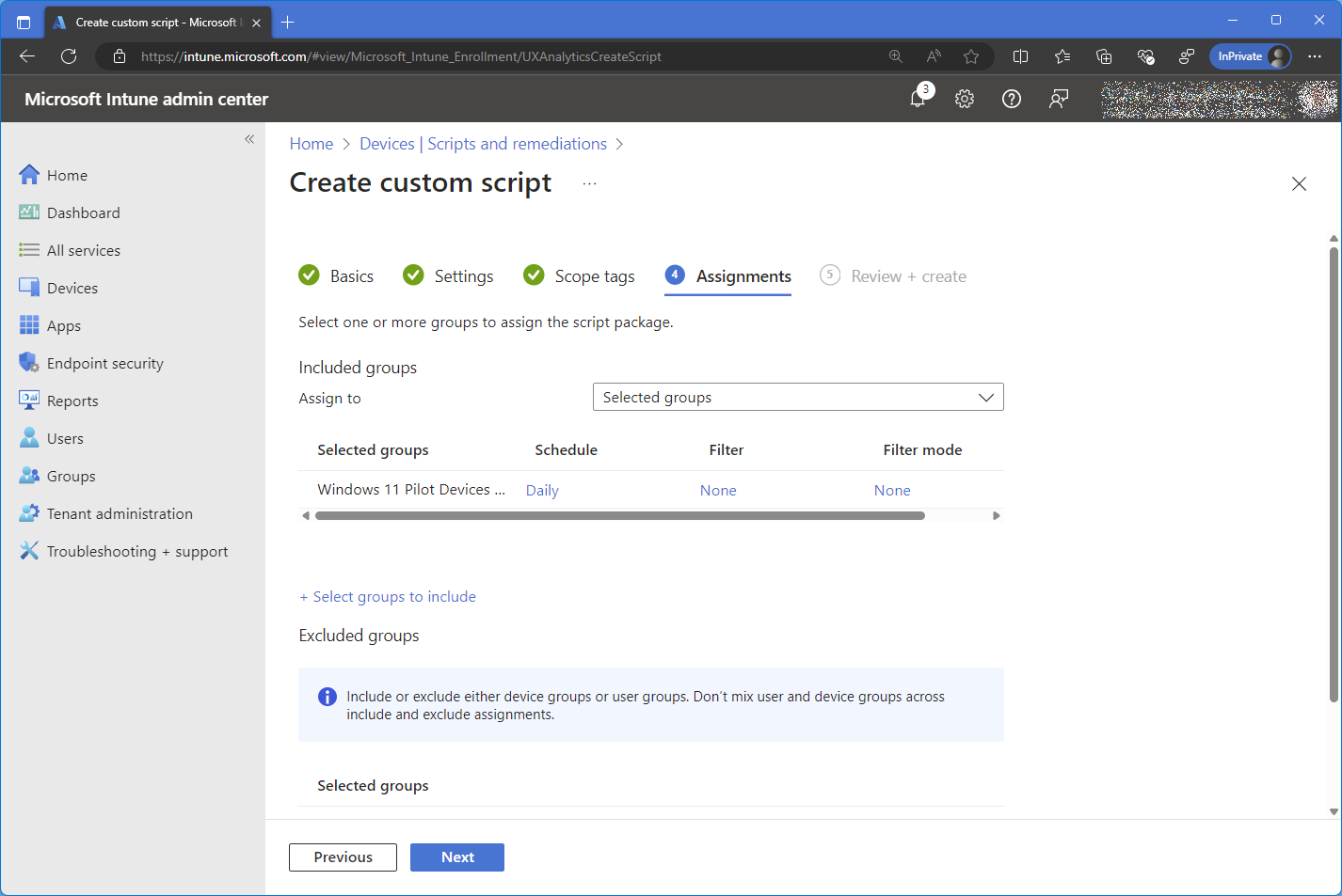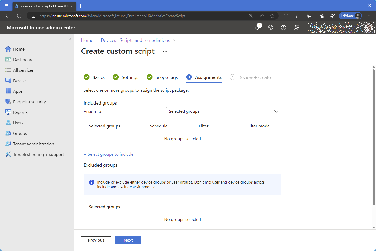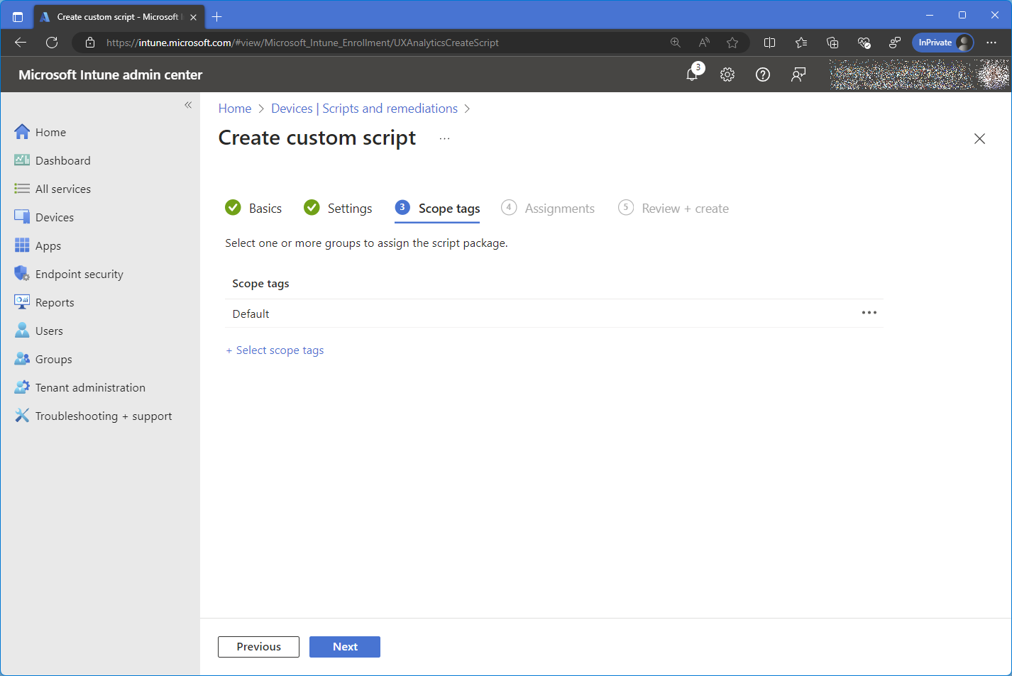 - On the Scope tags step of the custom script deployment, select any scope tags as appropriate to assign to the script package and choose Next.