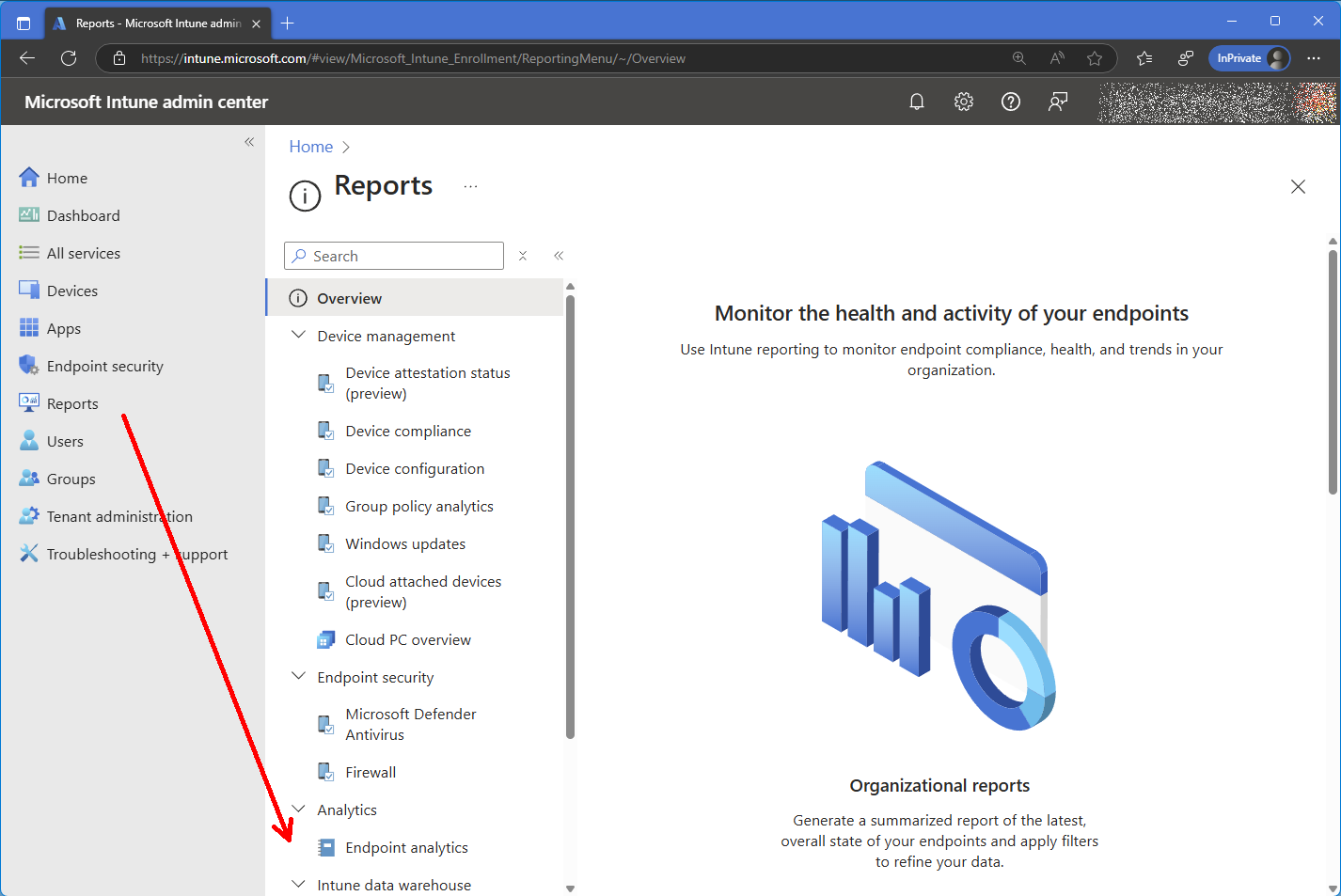 With an appropriately privileged account, navigate to the Microsoft Intune admin center and select Reports from the main menu.