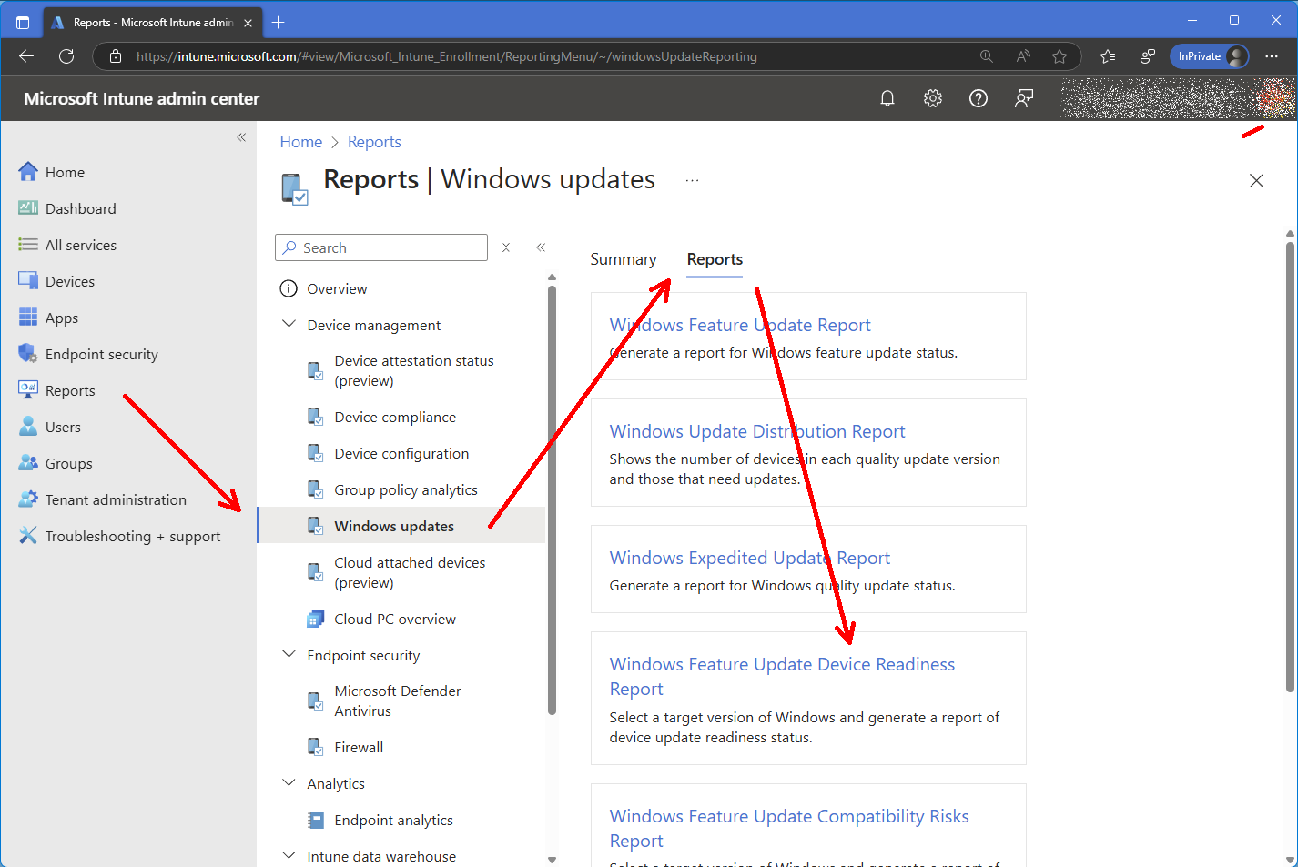 Then, select Windows updates from the submenu and choose the Reports tab to select Windows Feature Update Device Readiness Report.