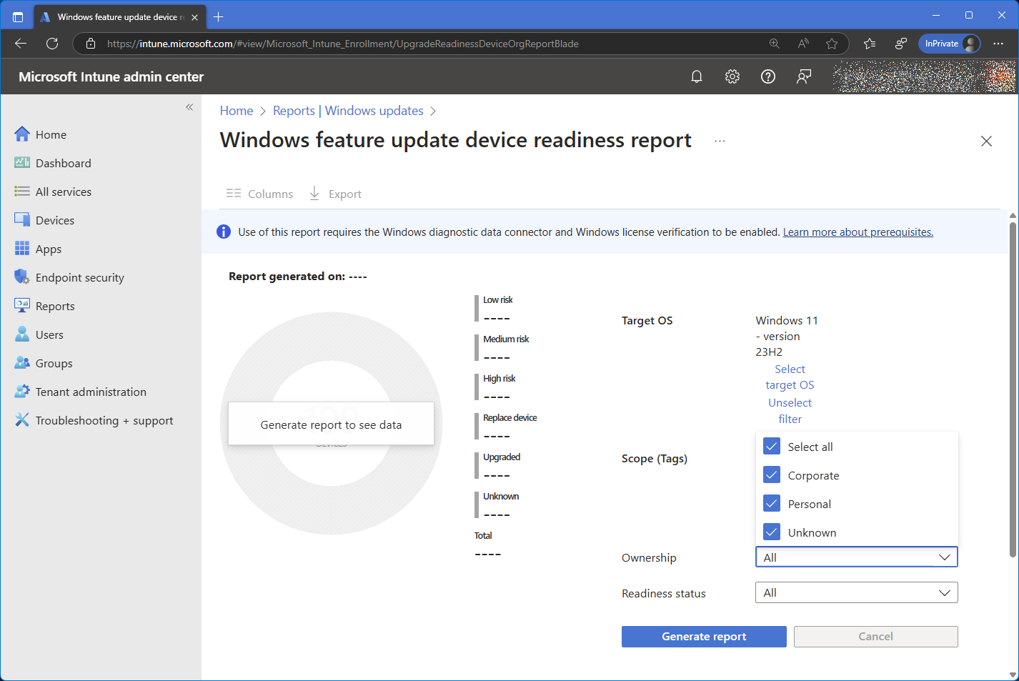 Check the Ownership dropdown and the Readiness status dropdown to filter out any devices you don't want to include in the report. Then, select Generate report.
