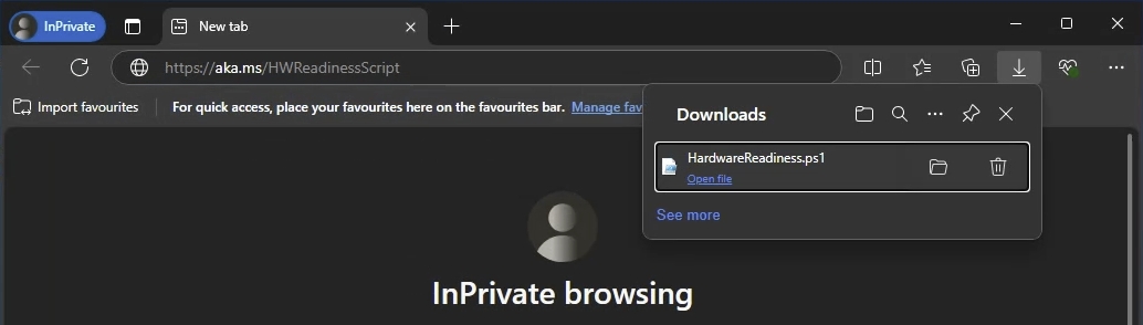 - Go to https://aka.ms/HWReadinessScript to download Microsoft's HardwareReadiness.ps1 script. Please make a note of the folder where the ps1 script has been downloaded.