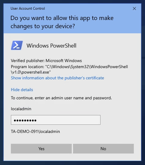 Note, you may see a User Account Control window asking "Do you want to allow this app to make changes to your device" and prompting for credentials of a device administrator. You will need to input appropriate credentials and select Yes to continue.