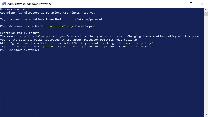 If asked to confirm you want to change the execution policy, type y and press [Enter] to confirm.